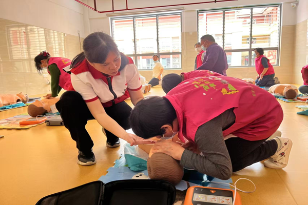 课堂讲授后,参训人员分组进行心肺复苏实操演练。从意识判断、救援呼叫,到胸外按压、人工呼吸及AED使用,讲师逐一纠正参训人员的操作细节,参训人员的操作逐步规范。