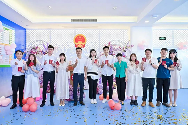户外颁证点经过精心打扮后,充满时尚浪漫氛围感。五对新人深情宣读结婚誓词,接过与会领导颁发的结婚证书,在大家的见证祝福下开启婚姻之旅。人们纷纷举起相机、手机,记录下这充满仪式感的瞬间。在领取了结婚证书后,新人们还陆续前往红塔湾旅游景区多个网红景点打卡体验。